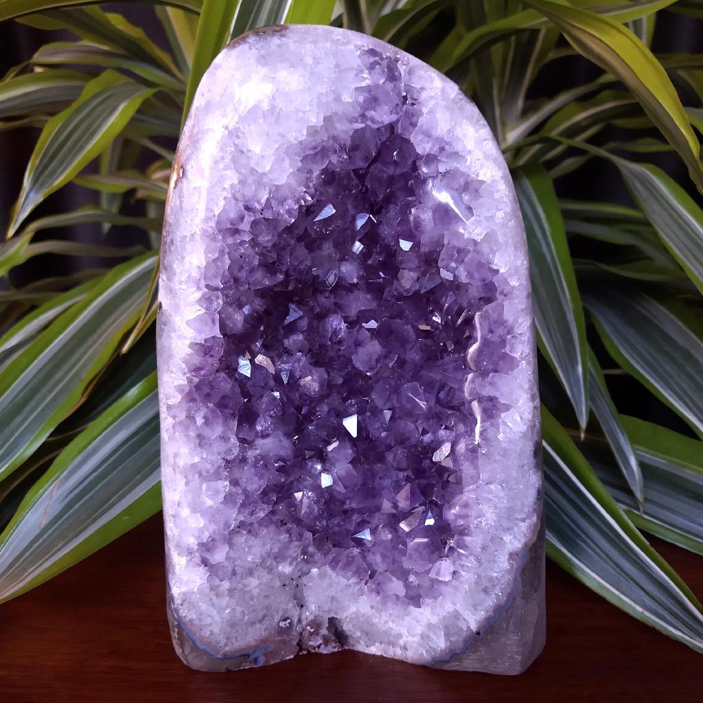 Amethyst specimen. Polished edge and base cut flat for display. 7.8 inches tall, 5.8 pounds in weight. This is a one-of-a kind item - you will receive the actual item in photo - once sold, it is gone.