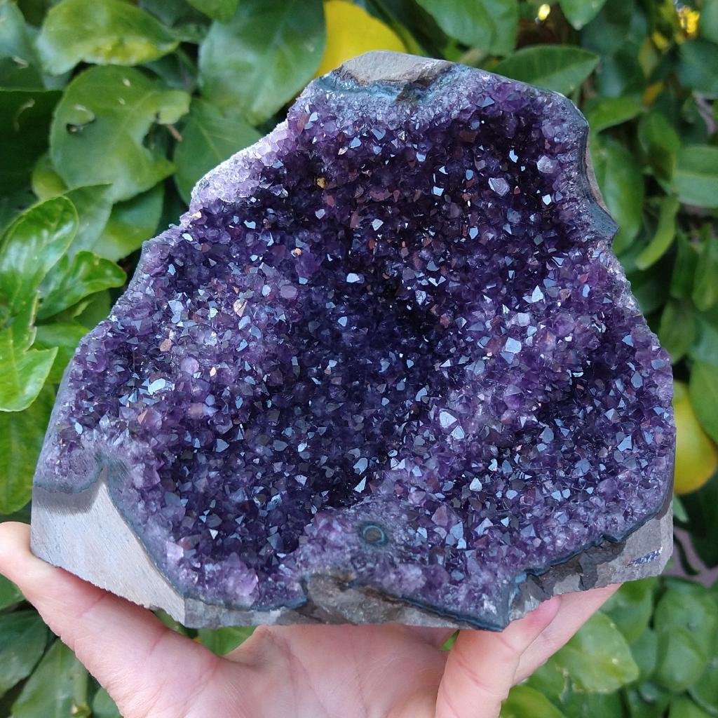 Amethyst specimen. Base cut flat for display. 6 inches wide, 4.5 inches tall, 3.77 pounds in weight.This is a one-of-a kind item - you will receive the actual item in photo - once sold, it is gone.