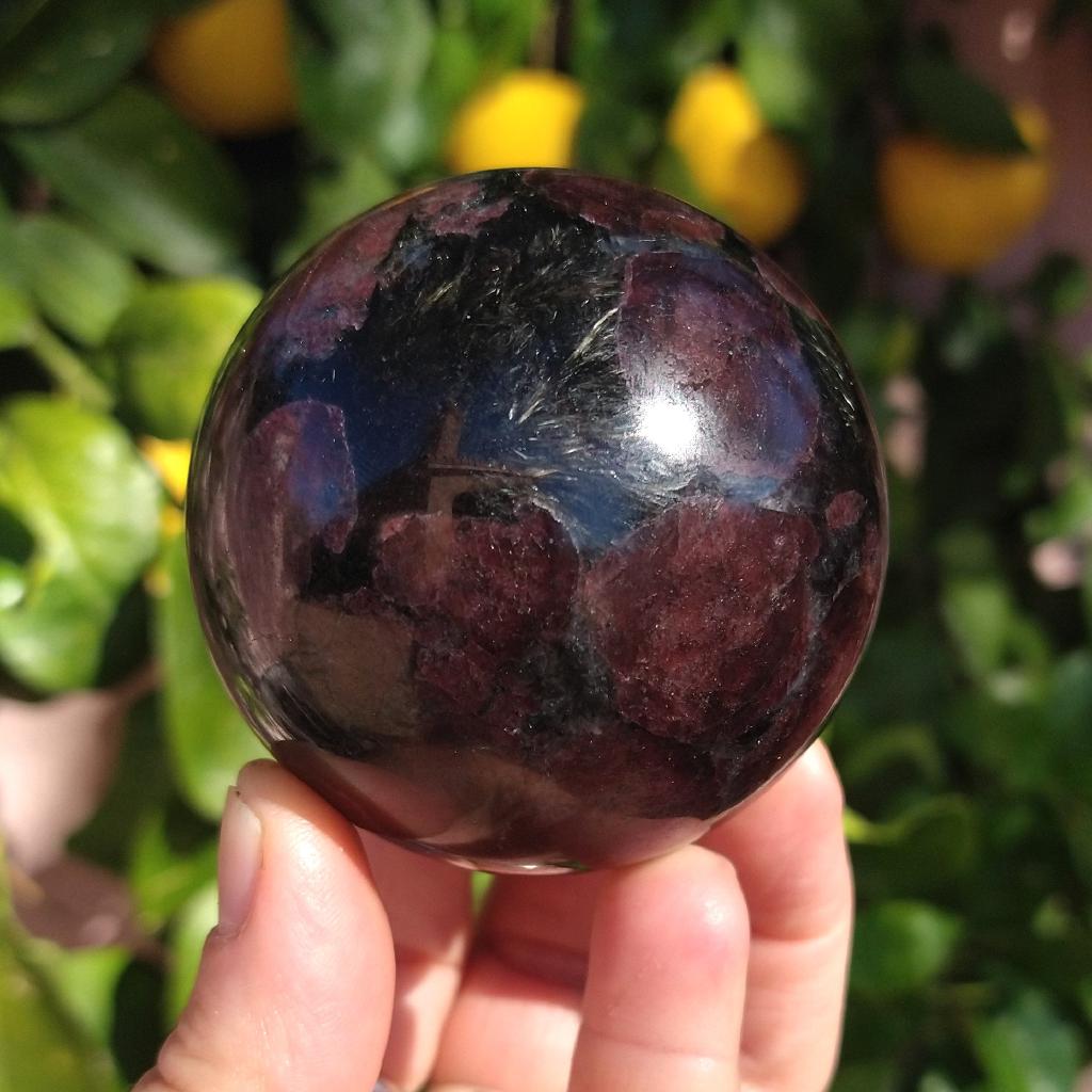 Garnet and Astropyllite Sphere, 2.85 inches in diameter, 0.85 pound in weight. This is a one-of-a-kind item - you will receive the actual item in photo. Once sold, it is gone.