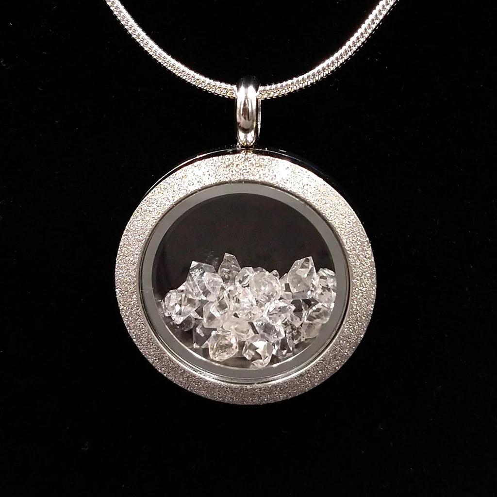 Herkimer Diamond Pendant, set in stainless steel with glass “window.” Pendant is 1 inch in diameter. 18 inch silver plated courtesy chain included.
