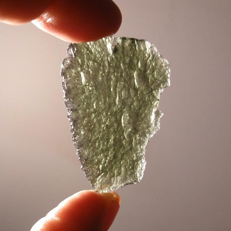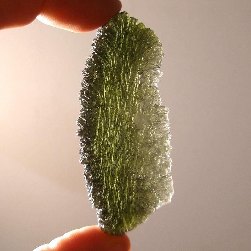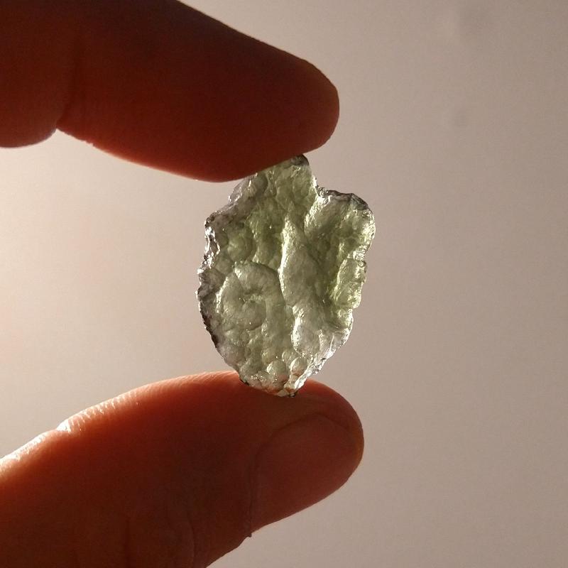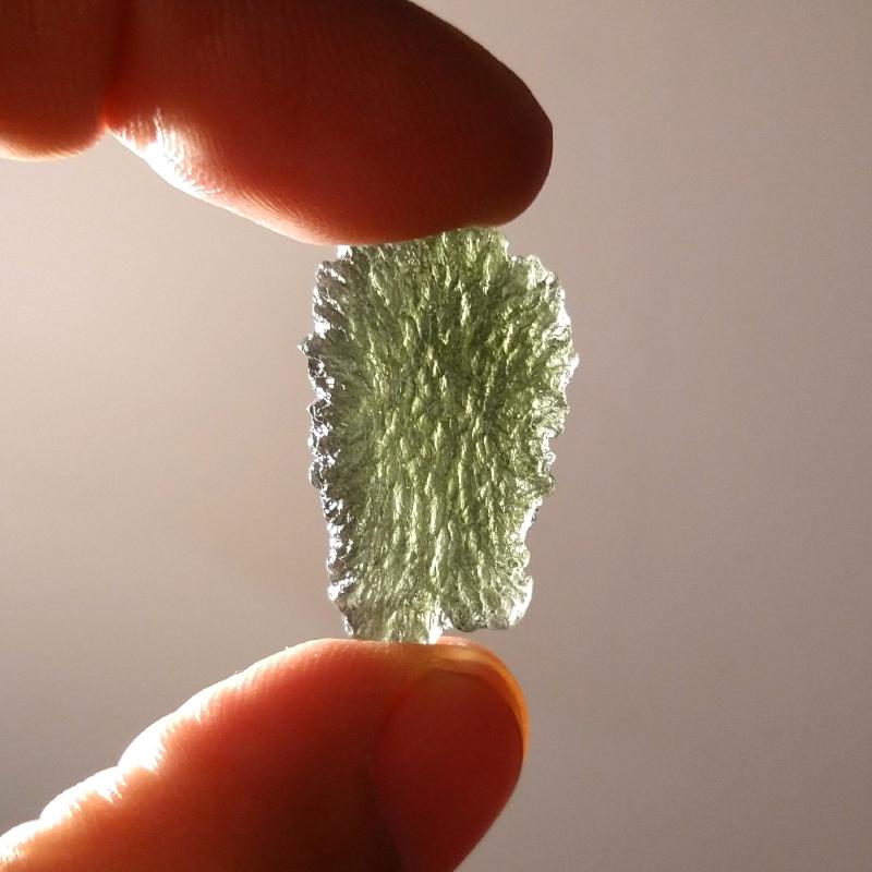 When this silica vapor reached the cold of outer space, it condensed then solidified and fell back to earth creating a strewn field of green tektite, several hundred miles away in the Moldau River Valley north of Prague, Czechoslovakia. Thus the name Moldavite. There are several location names for different areas of the valley where Moldavite is dug from the ground. The finest specimens are the Besed Nice, valued for their color, texture, and beauty. Moldavite is one of the rarest varieties of tektite.