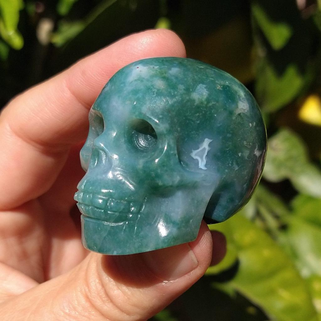 Small Moss Agate Skull. 2.7 inches long.This is a one-of-a kind item - you will receive the actual item in photo - once sold, it is gone.