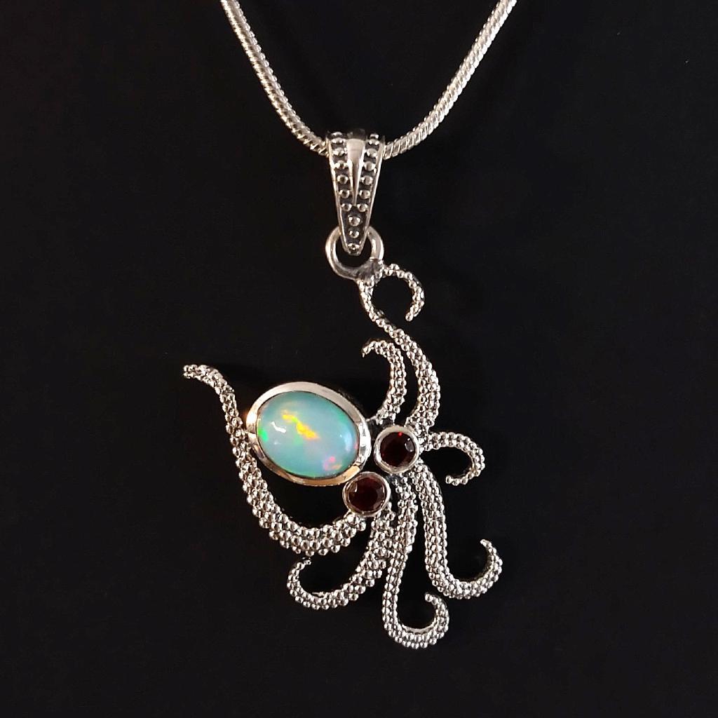 Ethiopian Opal & Garnet Octopus Pendant, set in sterling silver. 1.75 inches long including bail. 18 inch silver plate courtesy chain included. This is a one-of-a-kind item - you will receive the actual item in photo. Once sold, it is gone.