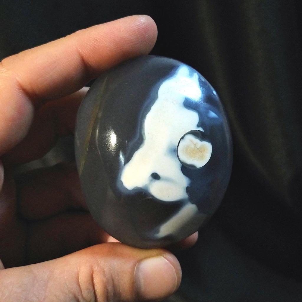 Orca Agate palm stone. 2.25 inches long, 0.25 pound in weight. This is a one-of-a-kind item. You will receive the actual item in photo. Once sold, it is gone.