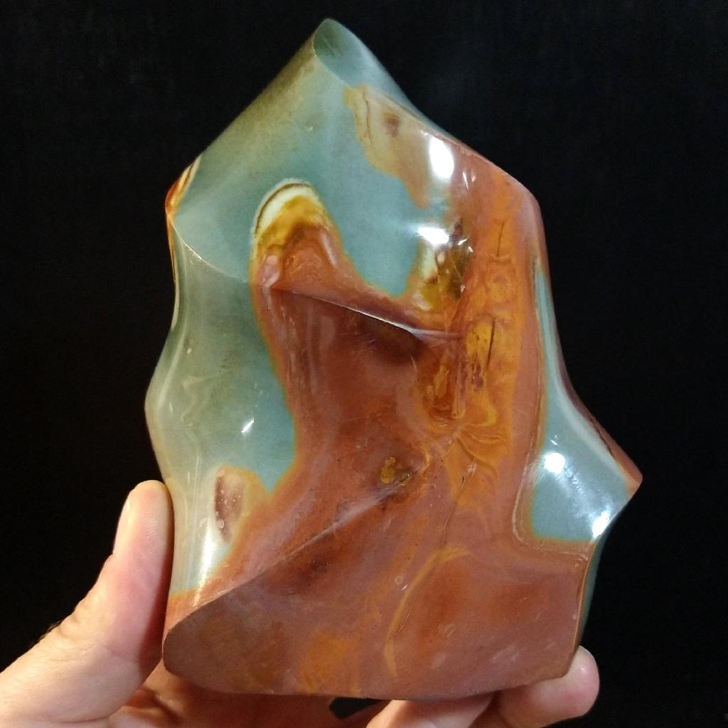 Polychrome Jasper cut & polished, from Madagascar. 4.75 inches tall, 1.64 pounds in weight.This is a one-of-a kind item - you will receive the actual item in photo - once sold, it is gone.