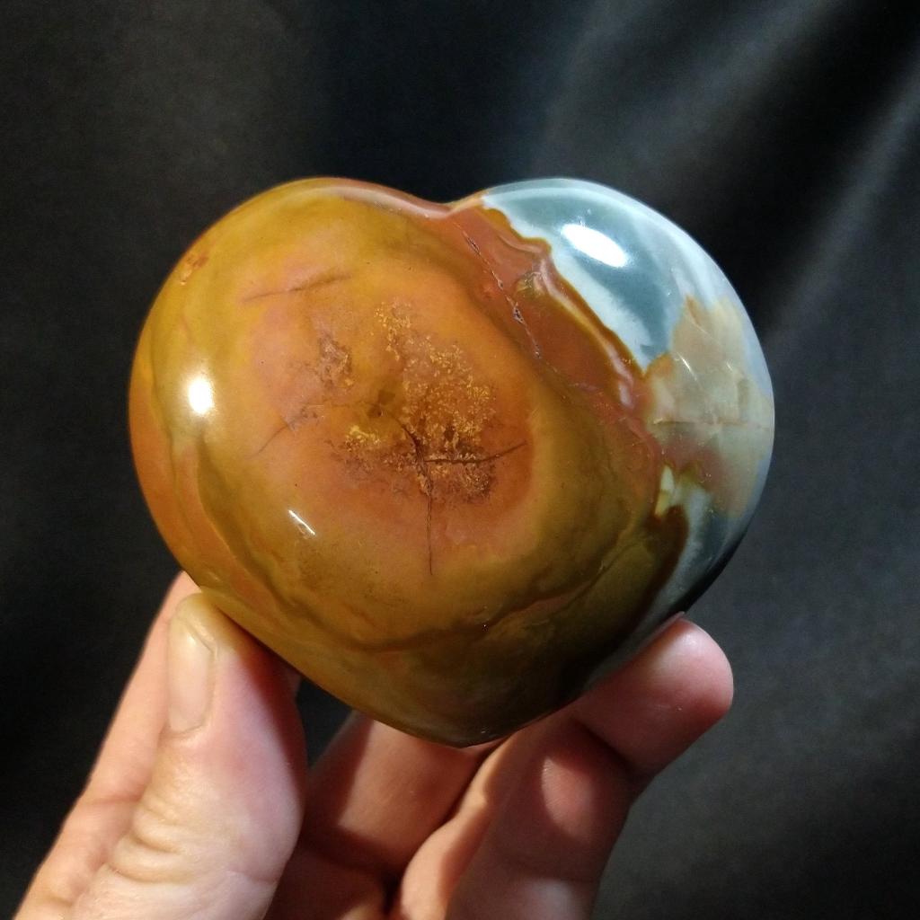 Polychrome Jasper Heart, from Madagascar. 2.8 inches long, 0.37 pound in weight. See additional image for reverse side.This is a one-of-a kind item - you will receive the actual item in photo - once sold, it is gone.