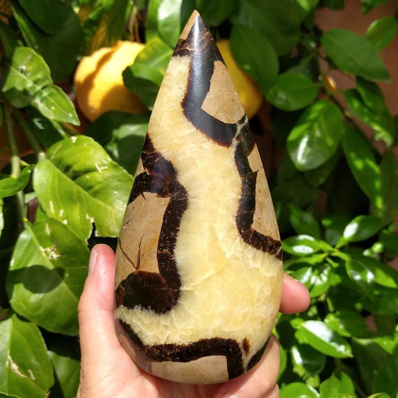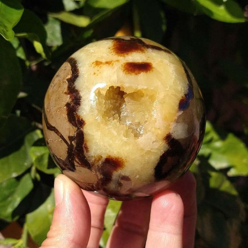 Septarians formed between 50 to 70 million years ago. As a result of volcanic eruptions, dead sea life was chemically attracted to the sediment around them, forming mud balls. As the ocean receded, the balls dried and cracked. Due to their bentonite content they also shrank in size, creating the cracks inside. As decomposed shells seeped down into the cracks in the mud balls, calcite crystals formed. The outer thin walls of calcite then transformed into aragonite. The name Septarian comes from the Latin word “septem”, meaning seven, because the mud balls had a tendency to crack in 7 points in every direction, thereby creating the distinctive pattern these nodules exhibit.