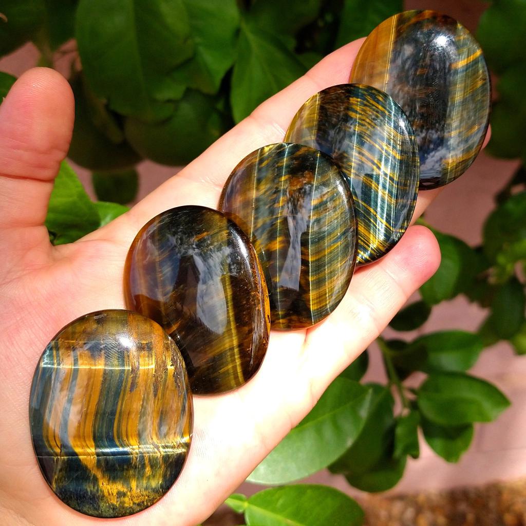 Tiger Eye Palm Stone# TE-50Blue-Gold Tiger Eye palm stone, approximately 2 inches long, Each one unique. Sold by the each.$9.00