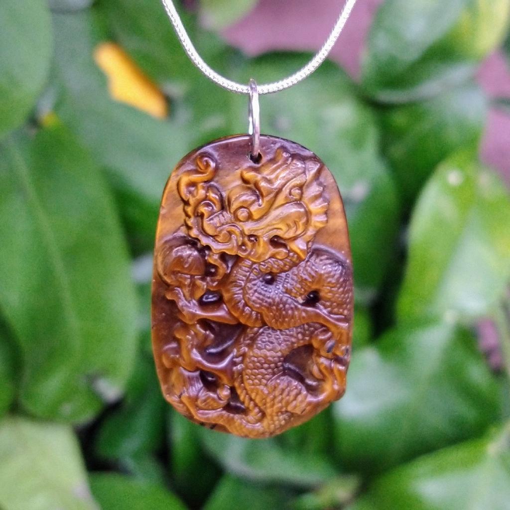 Tiger Eye Dragon Pendant, 1.7 inches long. 18 inch silver plate courtesy chain included. This is a one-of-a-kind item - you will receive the actual item in photo. Once sold, it is gone.